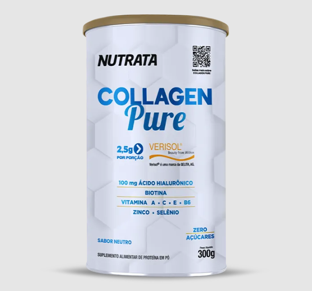 Collagen Pure é a combinação de 2,5g de peptídeos bioativos de colágeno Verisol® associado a um complexo de vitaminas e minerais, além de apresentar em sua fórmula biotina e 100mg de ácido hialurônico.
