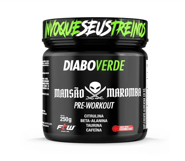 Deixe seu treino poderoso com o novo Pre-Workout MANSÃO MAROMBA, o pré treino do Toguro! Com 200mg de cafeína, em sua composição encontramos aminoácidos não essenciais como Beta-Alanina e a Taurina. A FTW saiu na frente das outras marcas e inovou na fórmula desse produto adicionando CITRULINA em sua composição. Para quem busca Performance, Desempenho e Resistência: A cafeína auxilia no aumento da performance no desempenho de exercícios físicos de resistência. O que é o Diabo Verde Mansão Maromba da FTW. Cada substância escolhida para o pre-workout Diabo Verde Mansão Maromba, foi pensada exclusivamente para o melhor desempenho das vias metabólicas do nosso organismo a combinação perfeita para o seu treino!
