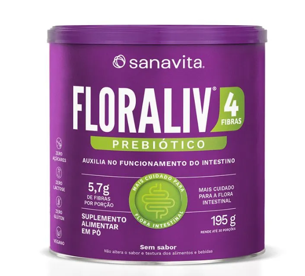Floraliv® 4 Fibras é um suplemento prebiótico com uma combinação de quatro fibras vegetais 100% solúveis, que auxiliam no equilíbrio da microbiota intestinal, promovendo vários benefícios ao funcionamento do intestino e à saúde. Uma porção contém 5,7g de fibras, entre elas a inulina, goma acácia, frutooligossacarídeos (FOS) e polidextrose.