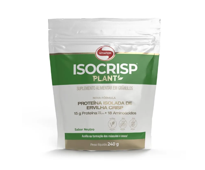 ISOCRISP® PLANT Vitafor é um suplemento alimentar em grânulos, fonte de proteínas (nutriente esse que auxilia na formação dos músculos e ossos). Sua forma inovadora de alimento proteico à base de proteína de ervilha pode ser consumida juntamente com cereais matinais, frutas, açaí, sopas ou saladas.